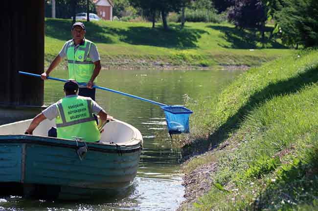 Eskişehir Büyükşehir Belediyesi’ne bağlı ekipler ise su yüzeyindeki ölü balıkları topladı