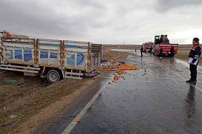 Eskişehir’de yağmurdan dolayı ıslanan zeminde virajı alamayarak yoldan çıkan meyve yüklü kamyonu devrilmesi sonucu 2 kişi hayatını kaybederken, 2 kişi de yaralandı.