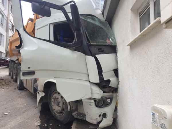 Eskişehir’de, freni boşalan hafriyat kamyonu 3 otomobile çarptıktan sonra bir binanın içine girdi. Kazada, tırın çarptığı evde yaşayanların piknikte olması faciayı önledi.