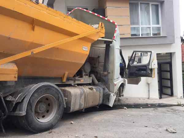 Eskişehir’de, freni boşalan hafriyat kamyonu 3 otomobile çarptıktan sonra bir binanın içine girdi. Kazada, tırın çarptığı evde yaşayanların piknikte olması faciayı önledi.
