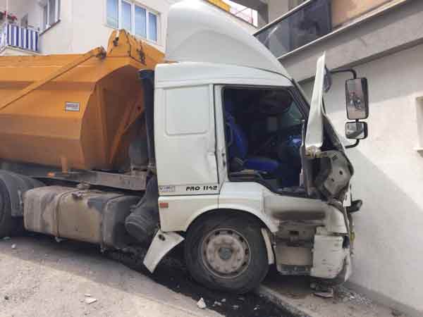 Eskişehir’de, freni boşalan hafriyat kamyonu 3 otomobile çarptıktan sonra bir binanın içine girdi. Kazada, tırın çarptığı evde yaşayanların piknikte olması faciayı önledi.