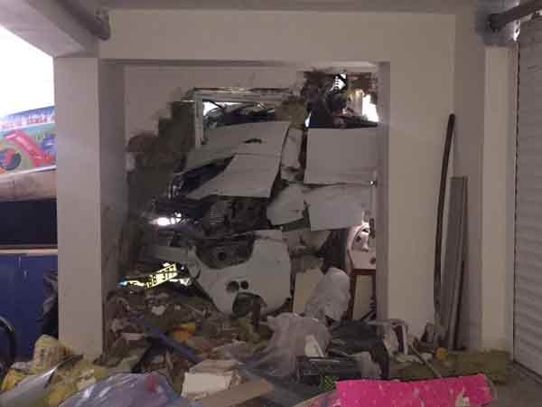 Yokuş olan yolda aşağı doğru hızlı bir şekilde inen kamyon, önüne çıkan 3 otomobile ve çevredeki ikametlere çarpıp, sokak sonunda bulunan binanın garajına girdi.