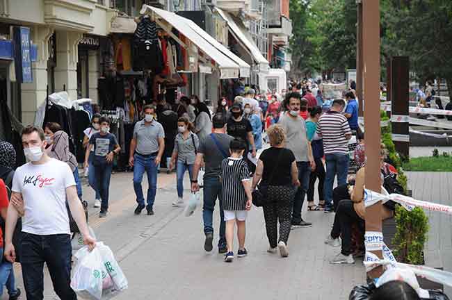 Eskişehirliler bayram alışverişi yapmak için adeta sokağa dökülüp sosyal mesafe kurallarını hiçe saydı.