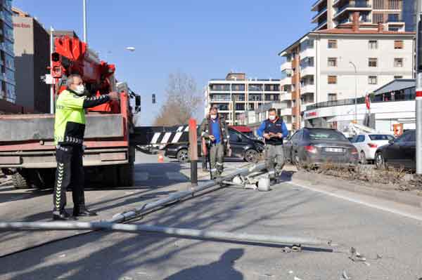 Eskişehir’de 2 aracın karıştığı maddi hasarlı trafik kazasında, üzerinde MOBESE kamerasının da bulunduğu aydınlatma direğinin devrilmesi sonucu yol uzun süre kapalı kaldı.