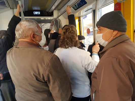 Ayrıca tramvaylarda virüse karşı alınan tedbirler doğrultusunda belirtilen yolcu sayısının çok üstünde kişi olduğu gözleniyor.