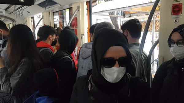 Sadece bir maske ile virüsten korunacağını düşünen vatandaşlar tramvaylarda sosyal mesafeyi yok sayıyor.