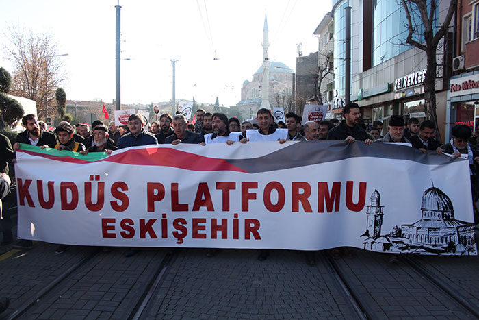 Amerika Birleşik Devletleri Başkanı Donald Trump’ın Kudüs’ü İsrail’in başkenti olarak tanıdıklarını açıklamasının ardından ülke genelinde olduğu gibi Eskişehir’de de bini aşkın kişi cuma namazı çıkışında karara tepki göstermek için toplanarak yürüdü.