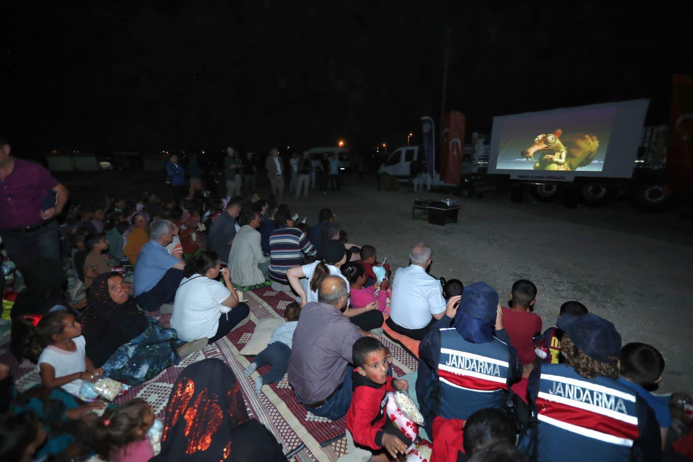Eskişehir Valisi Hüseyin Aksoy ve eşi Hülya Aksoy, “Gülümsemeyen Çocuk Kalmasın" projesi kapsamında mevsimlik işçilerin çocuklarıyla bir araya gelirken, onlarla yakından ilgilenip, bağdaş kurarak açık hava sinemasında film izledi