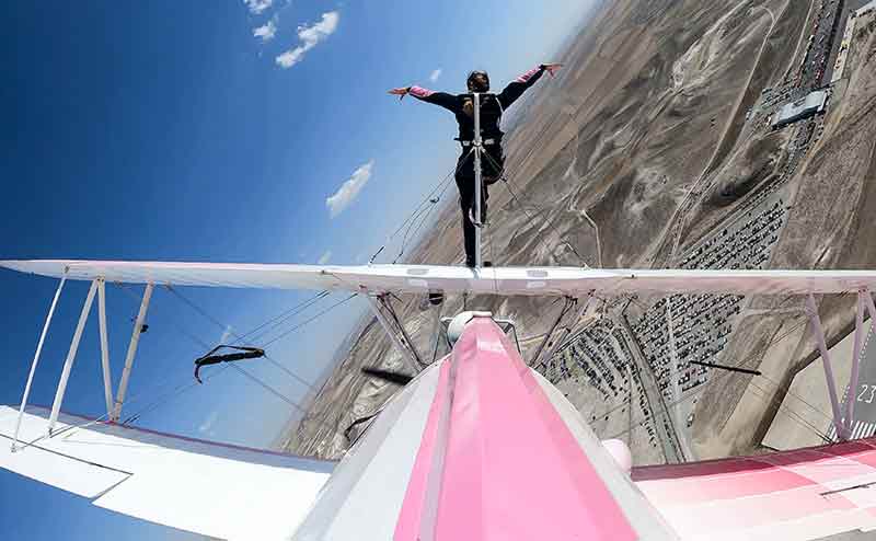 İsviçreli Danielle Del Buono'nun, pilot eşi Emiliano Del Buono kontrolündeki Boeing Stearman tipi uçak gökyüzünde süzülürken kanadında yürüdüğü anlar da kuyruktaki aksiyon kamerasına yansıdı.
