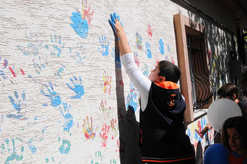 Eskişehir’in merkez Tepebaşı ilçesinde bulunan Bahçelievler Mahallesinde düzenlenen etkinlikte çocuklar, muhtarlık binasına boyaya batırdıkları el izlerini bıraktı.
