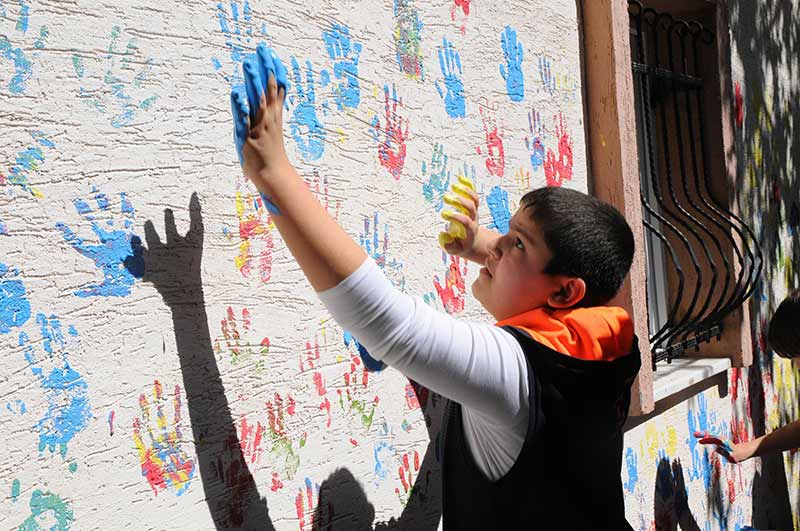 Eskişehir’in merkez Tepebaşı ilçesinde bulunan Bahçelievler Mahallesinde düzenlenen etkinlikte çocuklar, muhtarlık binasına boyaya batırdıkları el izlerini bıraktı.
