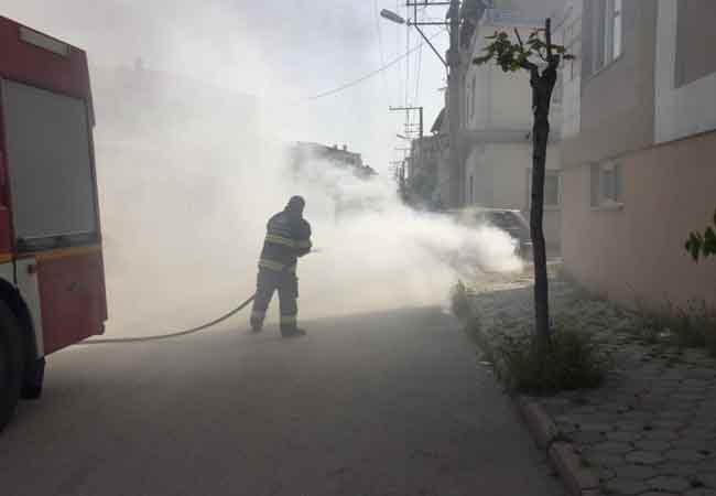 Tazyikli suyla yanan otomobili söndüren itfaiye ekipleri, LPG ve elektrik aksamını söktü.
