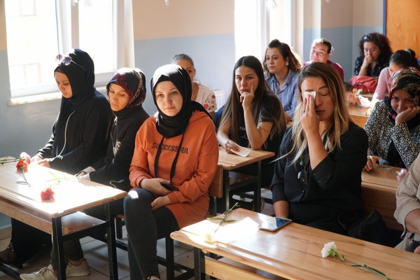 Eskişehir'de geçirdiği kazada yaşamını yitiren sınıf öğretmeni Burcu Öğretir için görev yaptığı okulda düzenlenen anma etkinliğinde, mesai arkadaşları, öğrencileri ve veliler gözyaşlarına hakim olamadı