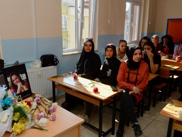 Eskişehir'de geçirdiği kazada yaşamını yitiren sınıf öğretmeni Burcu Öğretir için görev yaptığı okulda düzenlenen anma etkinliğinde, mesai arkadaşları, öğrencileri ve veliler gözyaşlarına hakim olamadı