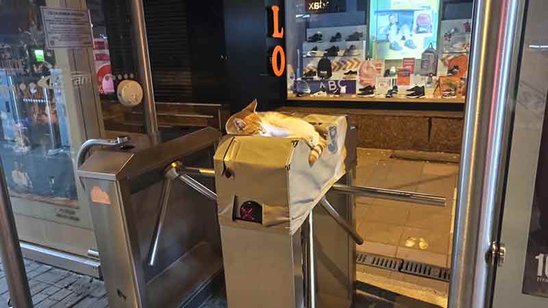 Eskişehir’de tramvay durağının turnikelerine yatan kedinin ilginç halleri, insanların sevgisine neden oldu.
