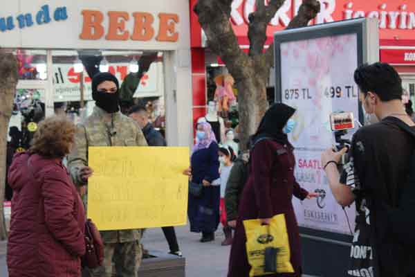 Eskişehir'de sosyal deney yapmak isteyen bir genç asker kıyafeti giydikten sonra 'Sizin için şehit oldum. Bana bir şey söyle' yazılı pankart ile caddede vatandaşların duygularını ölçmek istedi. Gencin bu deneyi bir çok vatandaşın duygu dolu anlar yaşamasına neden oldu.