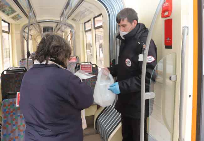 Korona Virüs ile Mücadele Eylem Planı kapsamında toplu taşıma araçlarında seyahat için maske zorunluluğu getiren Eskişehir Büyükşehir Belediyesi, tramvaylarda, bilet gişelerinde ve pazarlarda vatandaşlara ücretsiz maske dağıtıyor.