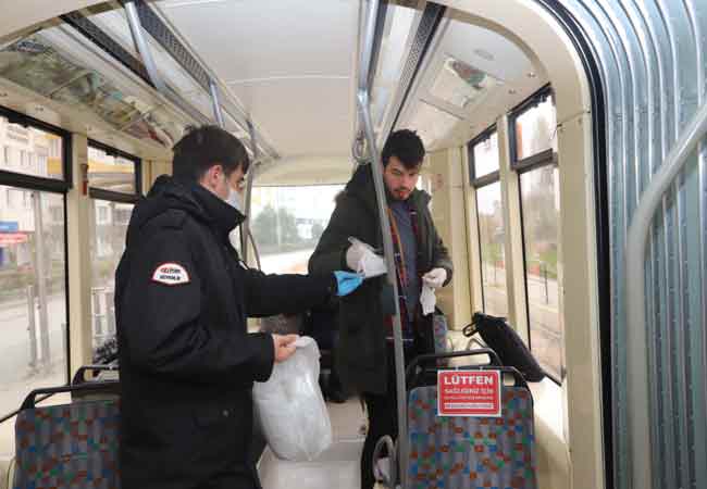 Korona Virüs ile Mücadele Eylem Planı kapsamında toplu taşıma araçlarında seyahat için maske zorunluluğu getiren Eskişehir Büyükşehir Belediyesi, tramvaylarda, bilet gişelerinde ve pazarlarda vatandaşlara ücretsiz maske dağıtıyor.