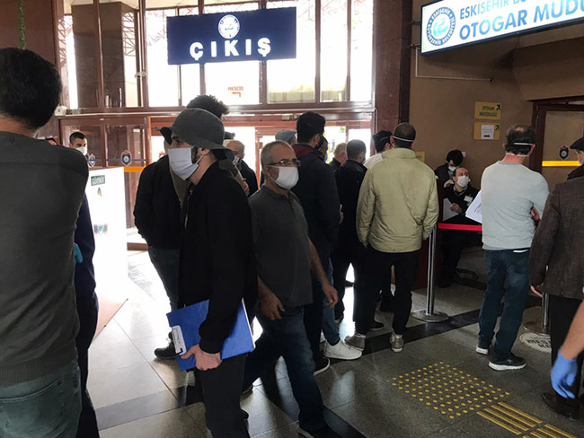 Eskişehir Şehirlerarası Otobüs Terminalinde oluşturulan Seyahat İzin Kurulu’na başvuran vatandaşların bazıları sosyal mesafe kuralına uymazken, kalabalık içinde maske bile takmayanların yer aldığı gözlendi.