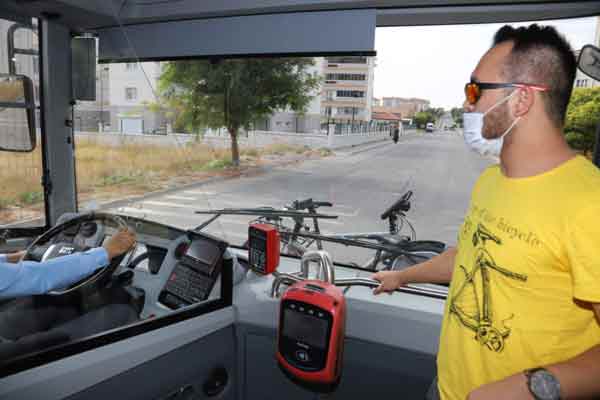 Uygulama kapsamında Vadişehir-Otogar hattında seferler gerçekleştiren Siyah 63 numaralı otobüslerin ön bölümlerine bisiklet aparatları takıldı.