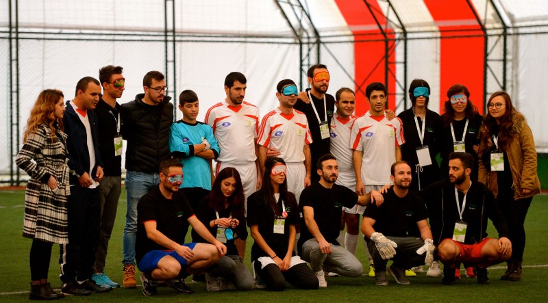 Eskişehir'de, 3 Aralık Dünya Engelliler Günü'nde farkındalık oluşturmak amacıyla Öz Görsem Spor Kulübü ile şarkıcı Haluk Levent'in başkanlığını yaptığı Anadolu Halk ve Barış Platformu (AHBAP) üyeleri, gözlerini bandajla kapatarak futbol maçı yaptı.