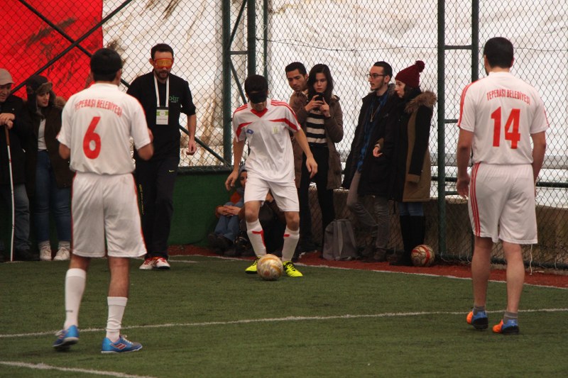 Eskişehir'de, 3 Aralık Dünya Engelliler Günü'nde farkındalık oluşturmak amacıyla Öz Görsem Spor Kulübü ile şarkıcı Haluk Levent'in başkanlığını yaptığı Anadolu Halk ve Barış Platformu (AHBAP) üyeleri, gözlerini bandajla kapatarak futbol maçı yaptı.