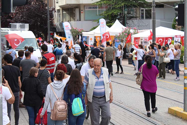 Seçim çalışmalarının hız kazanmasıyla demokratik görüntülerin ortaya çıktığı Eskişehir’de, partiler yan yana kurdukları stantlar ile 24 Haziran seçimleri için gün boyu propaganda yapıyor.