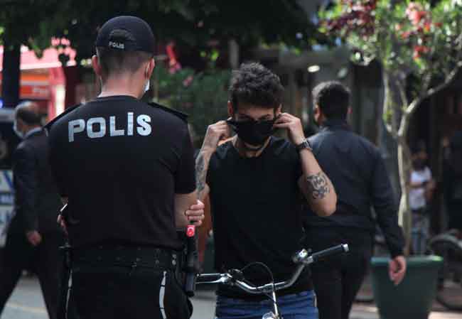 ...polis ve bekçi ekiplerini karşısında görünce çene bölgesinde tuttukları maskeleri olması gereken şekilde takmaya başladı.