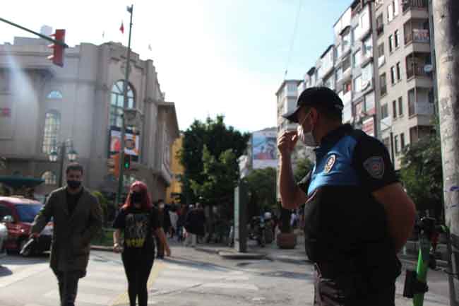 Eskişehir'de, polis ekipleri kentin işlek cadde ve sokaklarında maske denetimi yaptı. Gerçekleşen denetimlerde, kurallara uymayan kişilere idari para ceza uygulandığını fark eden bazı vatandaşlar, polisi görünce adeta maskesine sarıldı.