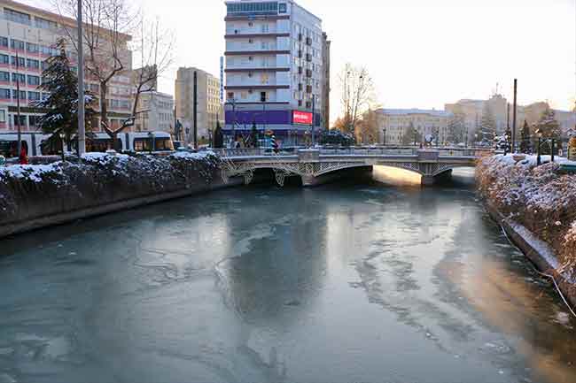 Eskişehir kent merkezinden geçen Porsuk Çayı aşırı soğuk hava nedeniyle buz tuttu.