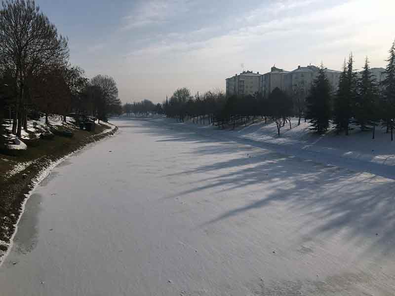 Hava sıcaklığının sıfırın altında seyrettiği Eskişehir’de, bir kısmı buz tutan Porsuk Çayı, beyaz örtüyle kaplandı.