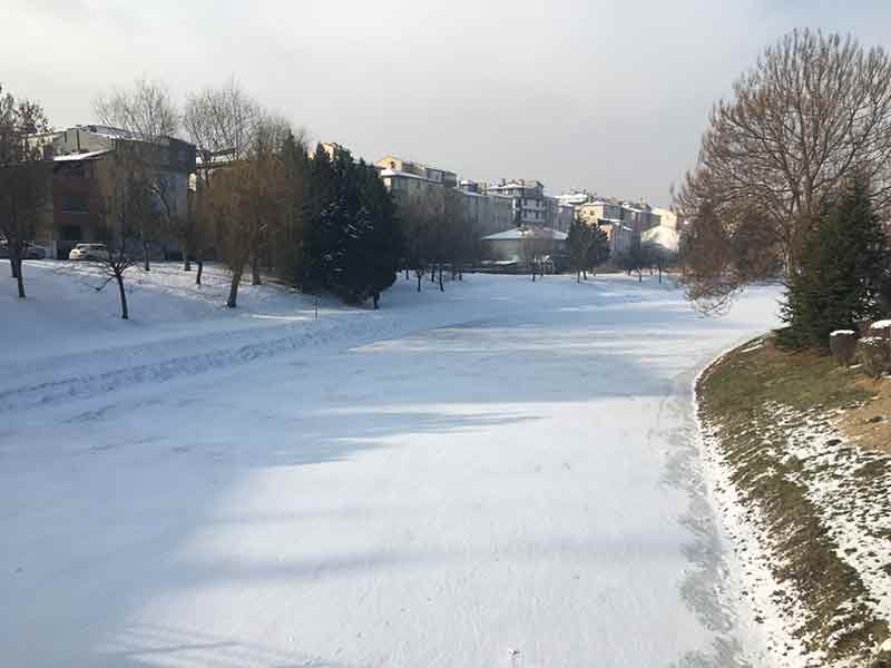 Hava sıcaklığının sıfırın altında seyrettiği Eskişehir’de, bir kısmı buz tutan Porsuk Çayı, beyaz örtüyle kaplandı.