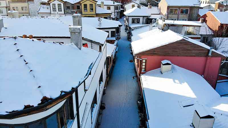 Eskişehir’de 2 gündür aralıklarla etkili olan kar yağışı, kentin turizm merkezlerinden biri olan tarihi Odunpazarı Bölgesi’nde kartpostallık manzaralar oluşturdu