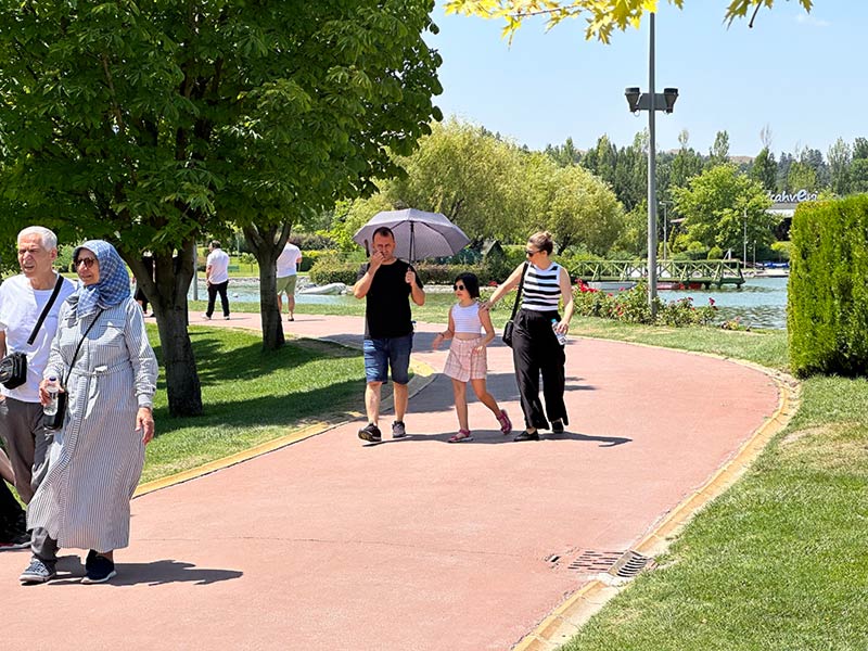 Eskişehir’de sıcak havadan bunalan vatandaşlar, güneşten korunmak için şemsiye kullandı.