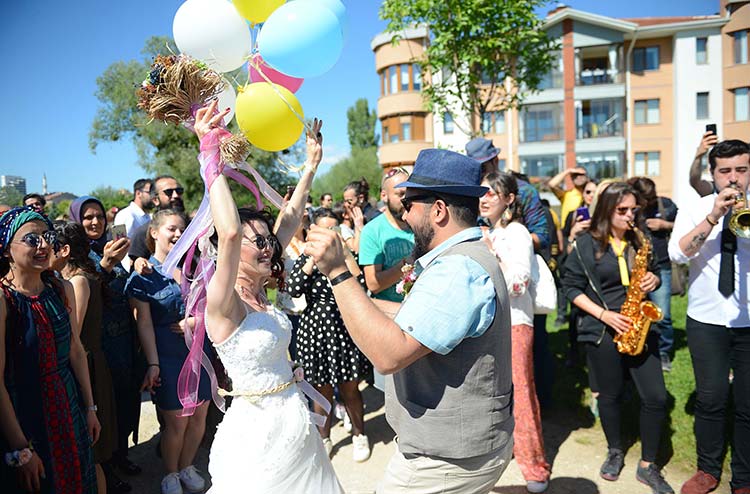 Eskişehir'de bir çift, halka açık parka davet ettikleri arkadaşlarıyla bando eşliğinde balon ve uçurtma uçurdu, Porsuk Çayı kenarında kıyılan nikahın ardından su savaşı yapıp eğlendiler.
