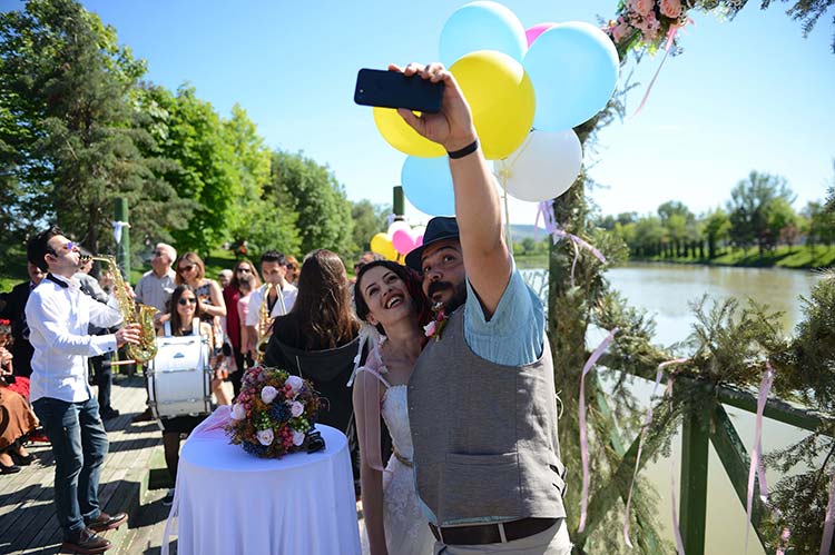 Eskişehir'de bir çift, halka açık parka davet ettikleri arkadaşlarıyla bando eşliğinde balon ve uçurtma uçurdu, Porsuk Çayı kenarında kıyılan nikahın ardından su savaşı yapıp eğlendiler.