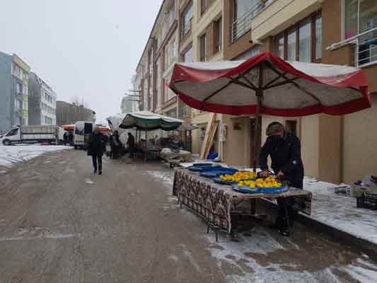 Kentin Şirintepe ve Yeni Bağlar mahallelerinde kurulan Pazartesi Pazarındaki esnaf, dondurucu soğukta bir yandan müşteri beklerken diğer yandan ürünlerine yağan karı temizlemek zorunda kaldı.