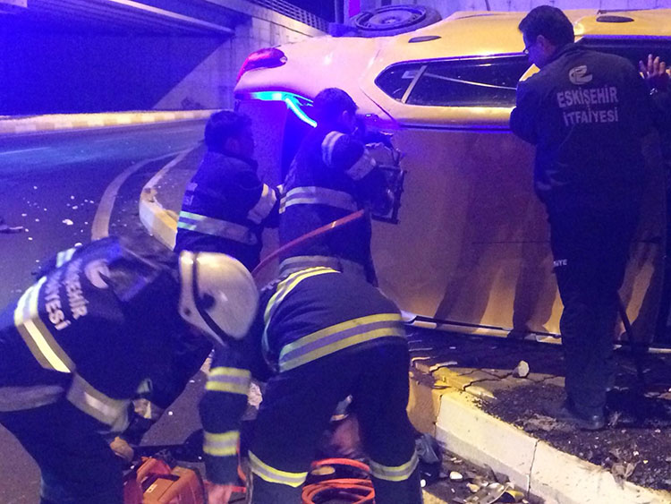 Eskişehir'de meydana gelen trafik kazasında, kontrolden çıkıp takla atan aracının içinde sıkışan taksi sürücüsü, itfaiye ekiplerinin çalışması sonucu kurtarıldı.