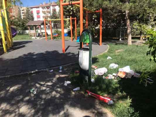 Park içerisinde oldukça fazla çöp poşeti ve kutusu bulunmasına rağmen çöplerin yerlere atılması dikkat çekti.