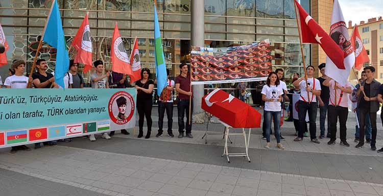 Eskişehir Kara Kalpaklılar Gençlik Hareketi üyeleri, Türk bayrağına sarılı temsili tabutla terörü protesto etti.