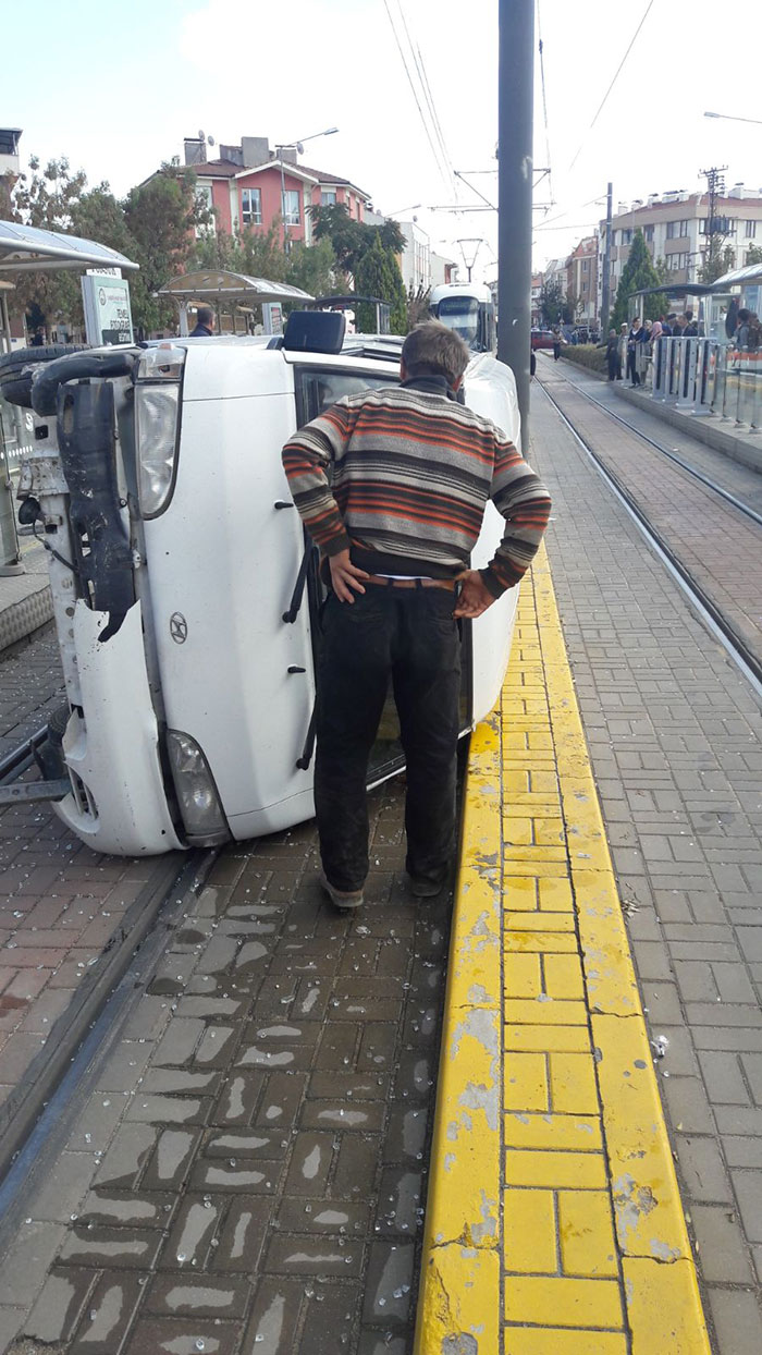 Tramvay durağına dalan ticari araç, durağa zarar verdikten sonra yan yattı. O sırada kimse olmaması muhtemel faciayı önledi.