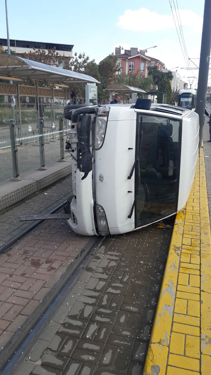 Tramvay durağına dalan ticari araç, durağa zarar verdikten sonra yan yattı. O sırada kimse olmaması muhtemel faciayı önledi.