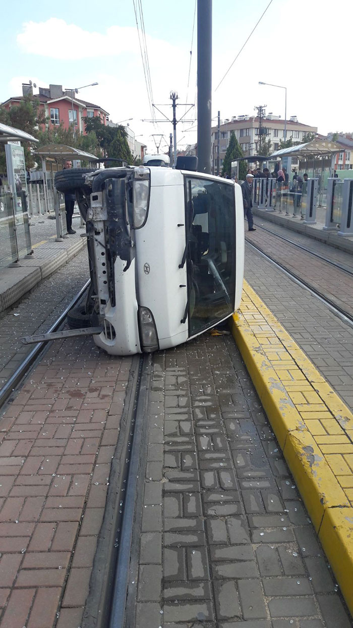 Tramvay durağına dalan ticari araç, durağa zarar verdikten sonra yan yattı. O sırada kimse olmaması muhtemel faciayı önledi.