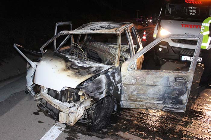 Eskişehir’de meydana gelen trafik kazasında 2’si çocuk 5 kişi yaralandı. Kaza sonrasında alev alev yanan araç kullanılamaz hale geldi.