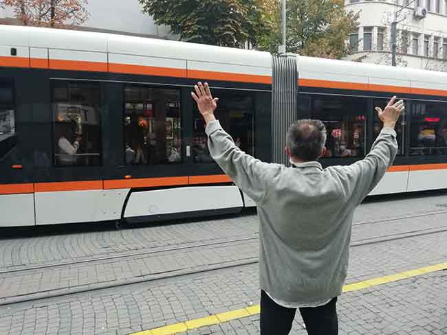 E.A. isimli vatandaş, tramvayın durakta durmasının ardından yoluna atlayarak ellerini kaldırdı.