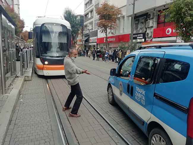 Eskişehir'de geçtiğimiz hafta yaşadığı binanın üçüncü katındaki evinden mutfak tüpü, koltuk, terlik gibi eline geçen her eşyayı sokağa rastgele fırlatan vatandaş, bu sefer de tramvayın önünü keserek ilginç anların yaşanmasına sebep oldu.