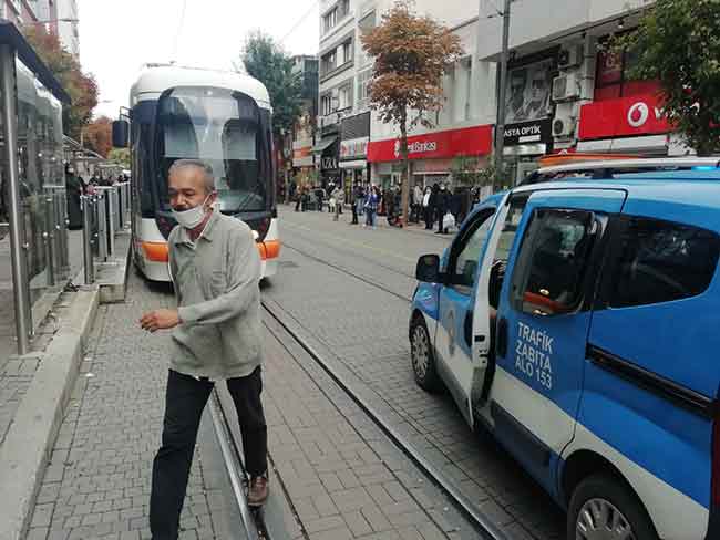 Eskişehir'de geçtiğimiz hafta yaşadığı binanın üçüncü katındaki evinden mutfak tüpü, koltuk, terlik gibi eline geçen her eşyayı sokağa rastgele fırlatan vatandaş, bu sefer de tramvayın önünü keserek ilginç anların yaşanmasına sebep oldu.