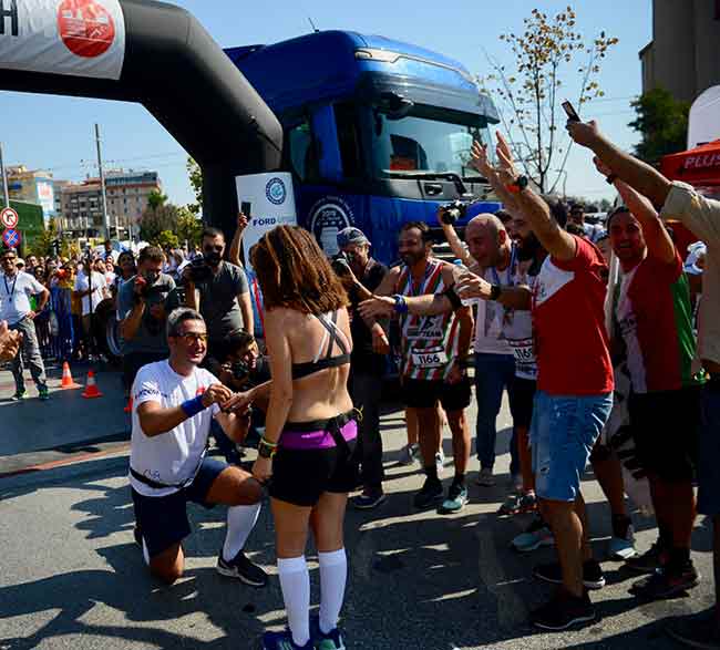 Kılıç, gazetecilere yaptığı açıklamada, maratona kız arkadaşıyla birlikte katıldıklarını belirterek, "Yarışa birlikte çok güzel başladık. Ayrıca ilişkimize de bir yarışta başlamıştık. Bu organizasyonda taçlandırdık. Bu tür koşulara her zaman devam etmeye çalışacağız. Yuvamızı bu şekilde kurmak, çocuklarımızı bu şekilde yetiştirmek istiyoruz." diye konuştu. Ebide Gökengin ise koşuda evlilik teklif almaktan duyduğu mutluluğu dile getirdi.