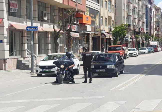Eskişehir'de koronavirüse karşı alınan tedbirler kapsamında uygulanan üç günlük sokağa çıkma kısıtlamasının ikinci gününde de polis ve bekçiler denetimlerini sürdürdü.