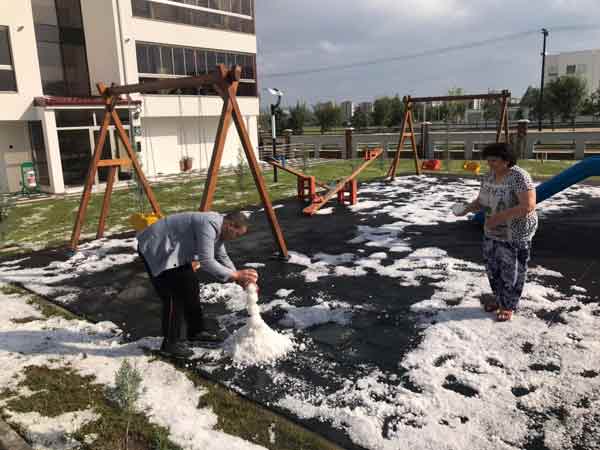 Yağan yoğun dolu yağışının ardından Aşağı Söğütönü Mahallesi'nde bulunan Drusilya Sitesi'nde dolunun ardından aşağı inen apartman sakinleri bembeyaz olan çimlerdeki doluları toplamaya başladı. Kardan adam yapmaya çalışan vatandaşlar işi eğlenceye dökerken, bir yandan da site garajının su dolması ise can sıktı. Dolunun ardından kardan adam yapmaya çalışan apartman sakini Erdem Karahan “Önce tabi seslerle birlikte hemen kapıya otoparka baktık. Oradaki araçları tahliye etmeyi denedik. Çok şiddetli yağışla birlikte garaj girişindeki su birikmesinden dolayı alt kat ve asansörlerin olduğu yere kadar yoğun bir şekilde su akışı oldu...